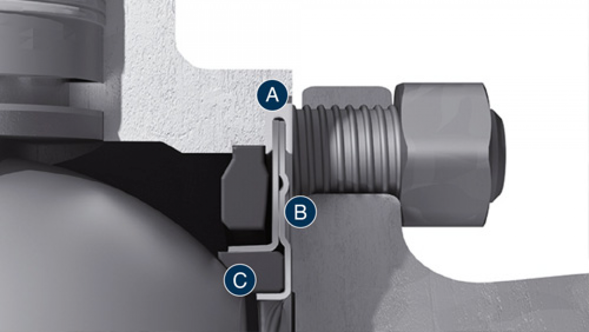 • B – Membranfjädern är avgörande för belastningen på tätningen under hela dess livscykel och säkerställer samtidigt erforderligt tryck hos tätningsringen. Detta innebär att tätningen förblir tät – oberoende av medietryck och flödesriktning.