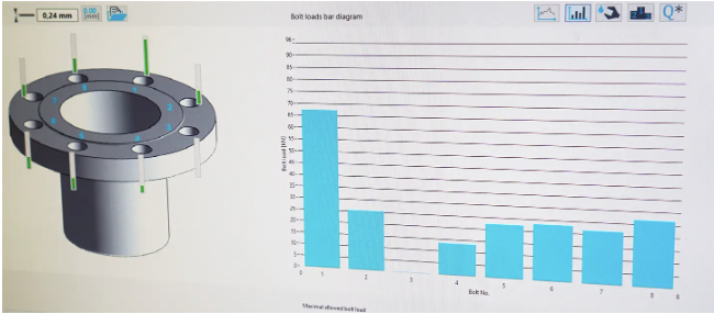 I det här exemplet drogs skruvarna en gång runt flänsen (bild A, FEL) och en gång i ett korsmönster (bild B, KORREKT). Krafterna som verkar på varje bult och packningens tjocklek mättes i varje fall. En momentnyckel användes i båda fallen.