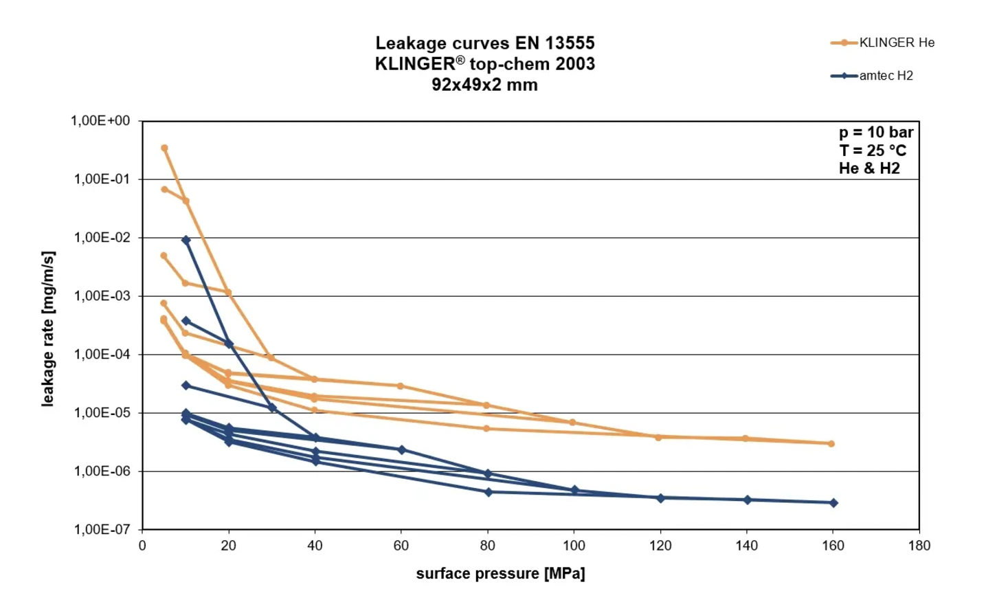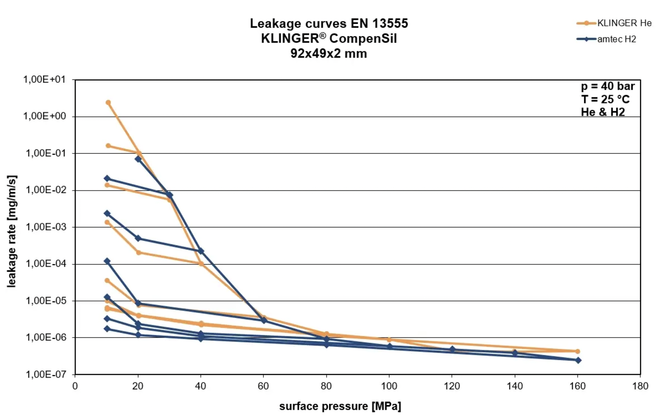 För att ge kunderna extra trygghet vid flänsanslutningar för väteapplikationer har KLINGER Dichtungstechnik utfört ett stort antal EN 13555-tester med helium vid de lägsta nödvändiga komprimeringsvärdena. Dessutom har väteprovningar genomförts externt i samarbete med en ackrediterad partner.